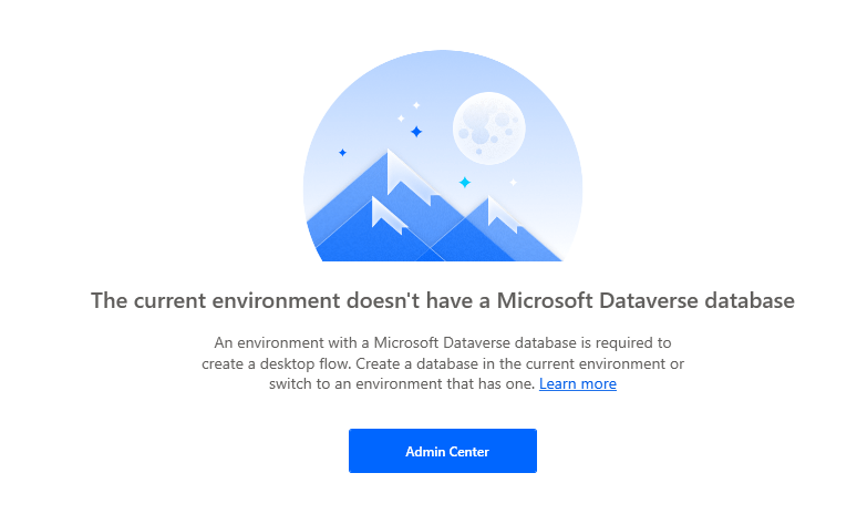 Message – An Environment with a Microsoft Dataverse database is required to create a desktop flow. Create a database in the current environment or switch to an environment that has one.