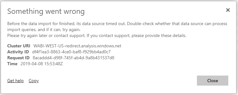 Error Message: Before the data import for finished, its data source timed out. Double-check whether that data source can process import queries, and if it can, try again.