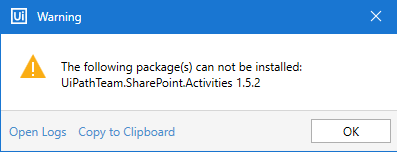 Initial Error – The following package(s) can not be installed: UiPathTeam.SharePoint.Activities 1.5.2.