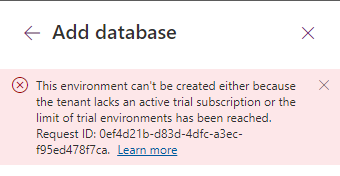 When creating a new environment in Power Platform Admin center, you might see an error message coming up. This environment can't be created either because the tenant lacks an active trial subscription or the limit of trial environments has been reached.